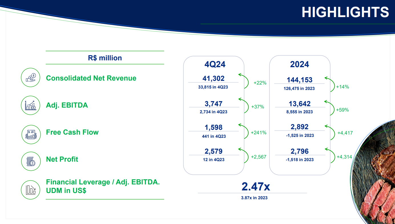 净收入(Net revenue)创历史新高:2024年第四季度,Minerva实现净收入107.14亿雷亚尔(约18.34 亿美元),创历史季度最高纪录,同比增长73.8%,环比增长26%。全年净收入达340.7亿雷亚尔(约58.33 亿美元),同比增长26.7%,得益于新资产的并表、出口市场需求复苏,以及节日季节性消费的拉动。