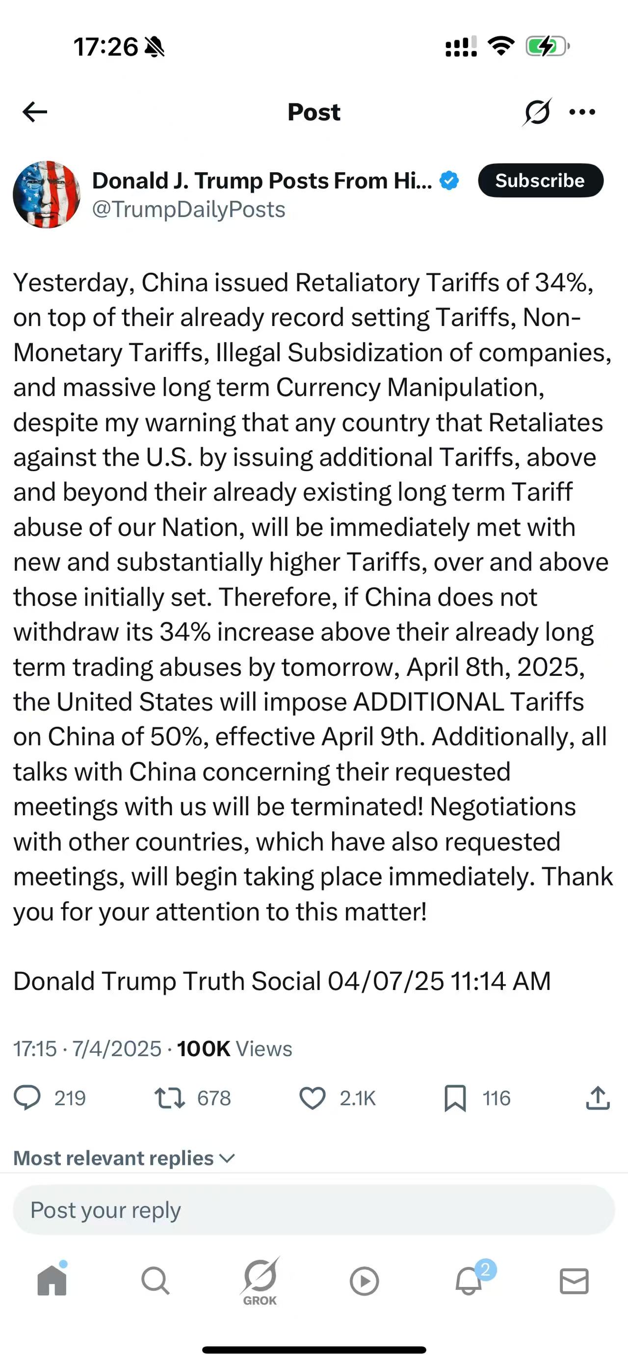 因此,如果中国不在明天(2025年4月8日)之前撤回其在长期贸易滥用基础上额外增加的这34%关税,美国将于4月9日起对中国加征额外50%的关税。