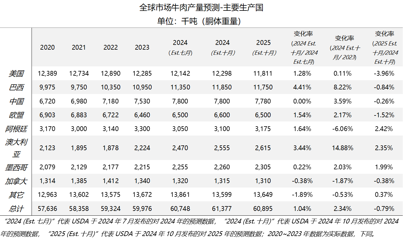 展望2025年,全球牛肉产量预计将略微下降0.79%,达到6,089.5万吨。这是由于巴西、欧盟和美国产量的下降抵消了阿根廷、澳大利亚、墨西哥产量的增长。