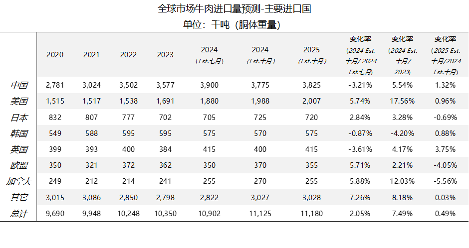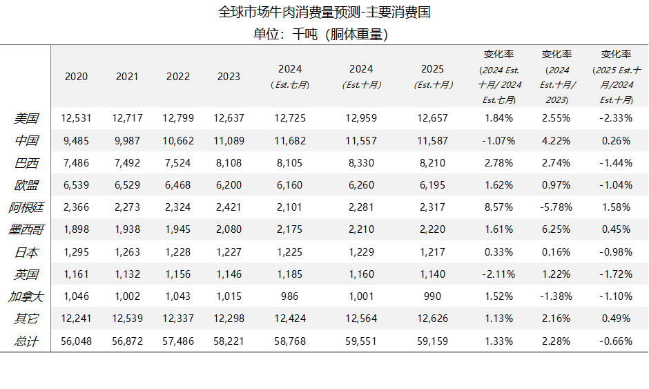 与7月的预测相比,10月的最新预测数据显示2024年全球牛肉进口量略有上调,总体增长了2.05%。其中,美国和加拿大的牛肉进口量预测显著增加,分别增长了5.74%和5.88%。中国和英国的进口量预测则有所下调,分别减少了3.21%和3.61%。